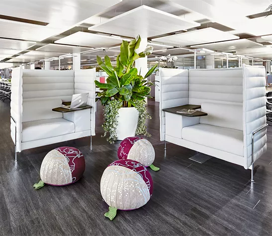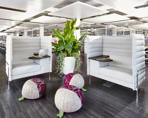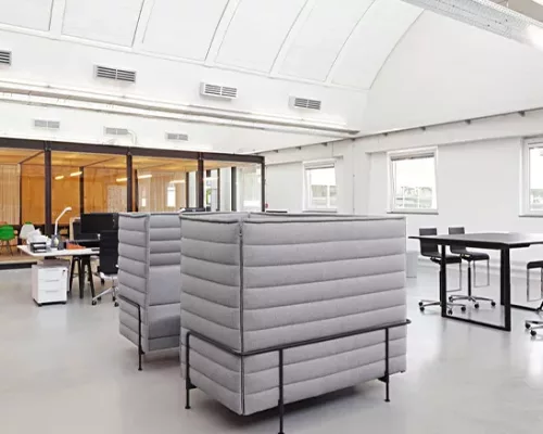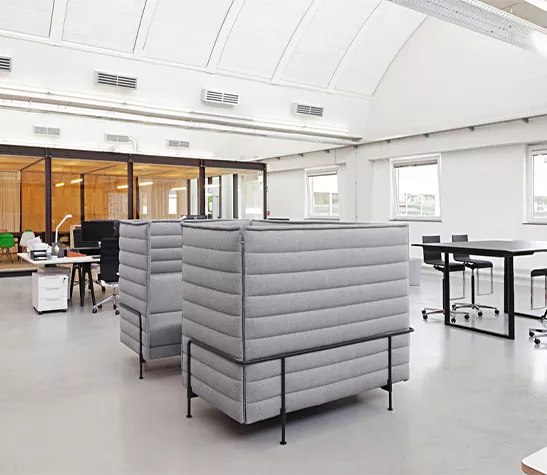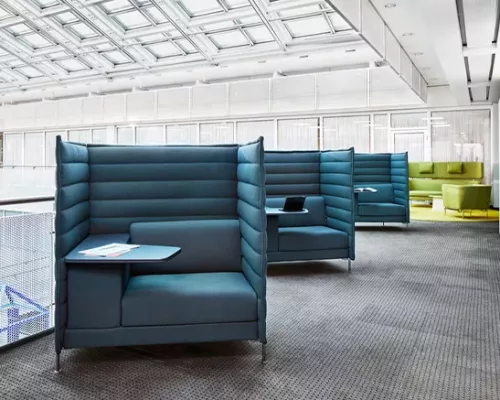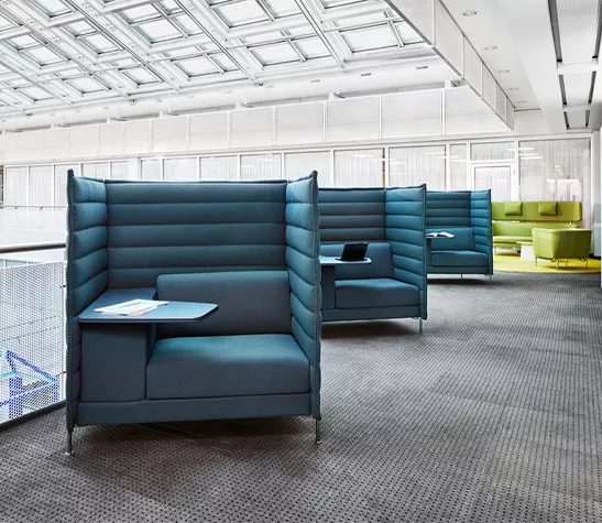 Les canapés Alcove créent un cadre parfait pour le travail concentré ou pour de petites réunions. Il existe des modèles avec des panneaux plus bas pour faciliter la communication, des roulettes ou avec un rembourrage dans différents degrés de fermeté.