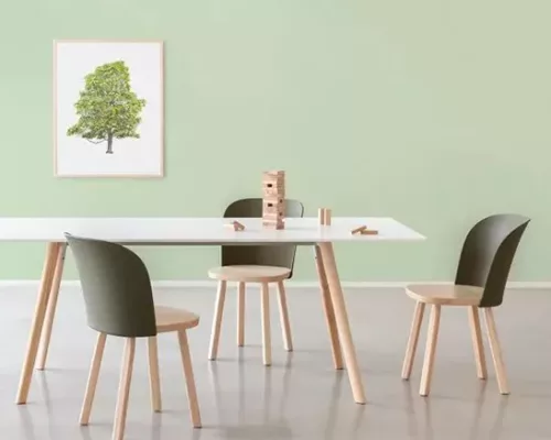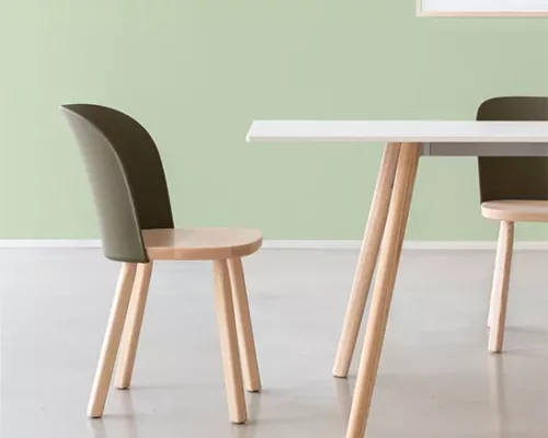 Alpina est disponible en trois variantes : assise et pieds en frêne naturel avec un dossier vert olive, assise et pieds en frêne naturel avec un dossier beige, assise et pieds en frêne teinté noir avec un dossier noir. Elle convient aussi bien à un usage domestique qu’à un usage professionnel.