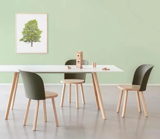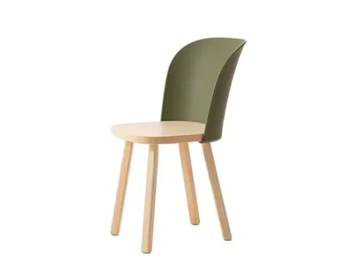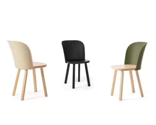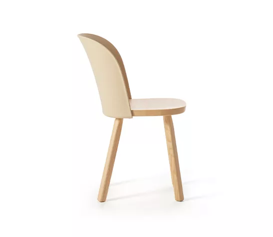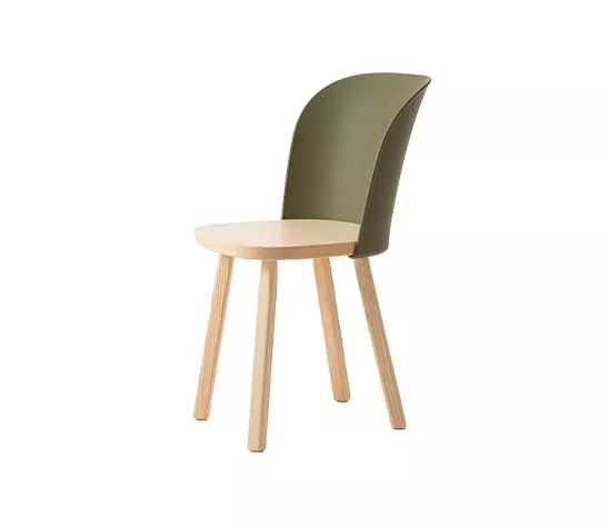 Simple et épurée, mais courbée et enveloppante, la nouvelle chaise associe une structure en bois de frêne massif (certifié FSC) à un dossier moulé par injection en polypropylène biosourcé provenant à 100 % d’huiles de cuisson usagées. Entièrement recyclable.