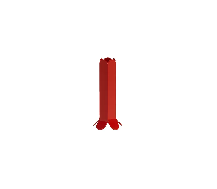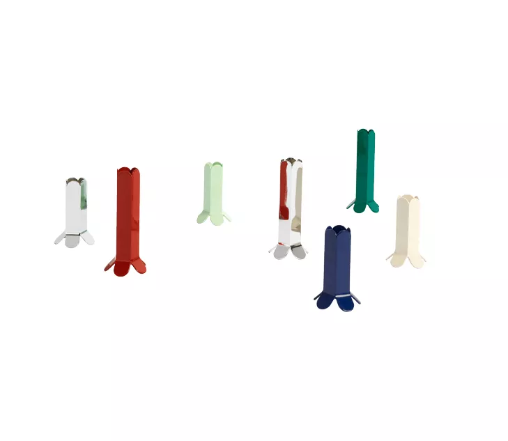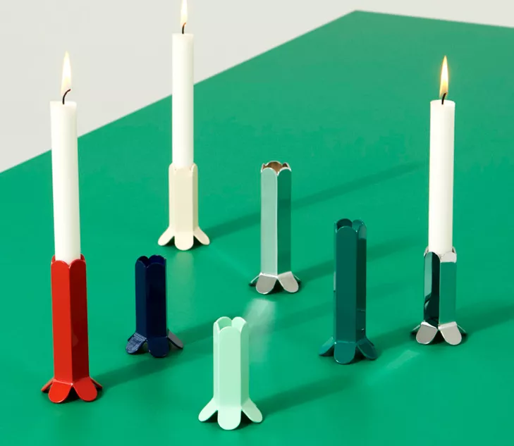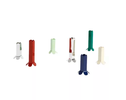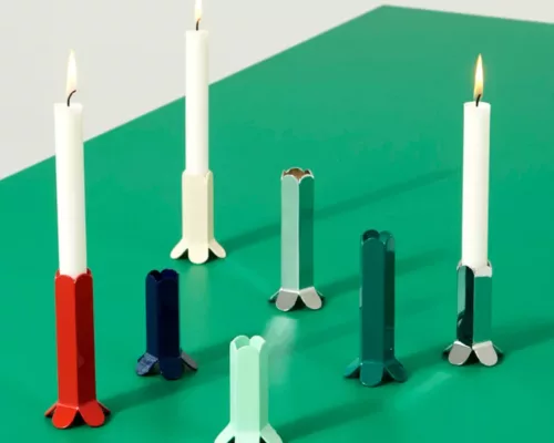 Leur forme sculpturale, déclinée en différentes couleurs et tailles, s’éloigne de la norme omniprésente du bougeoir pour explorer une nouvelle dimension qui lui est propre. Cinq piliers arrondis se rejoignent pour former un pentagone allongé abstrait, reposant sur des pieds pliés.
