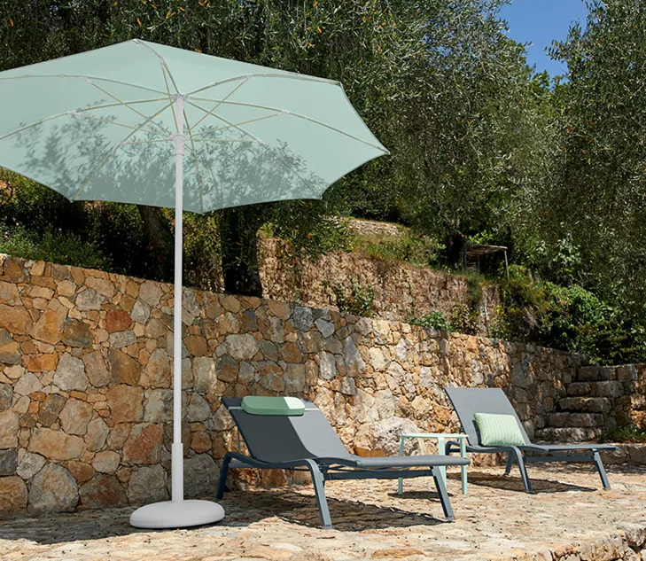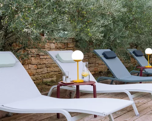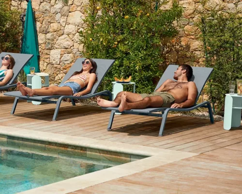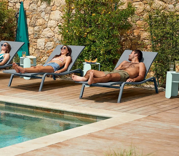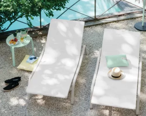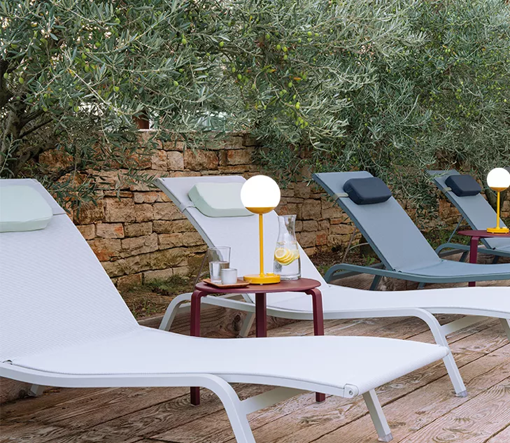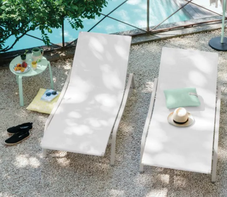 Ce bain de soleil design, par sa structure en aluminium et son habillage en Toile Technique d’Extérieur indéchirable, est optimisé pour résister en extérieur.