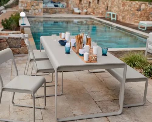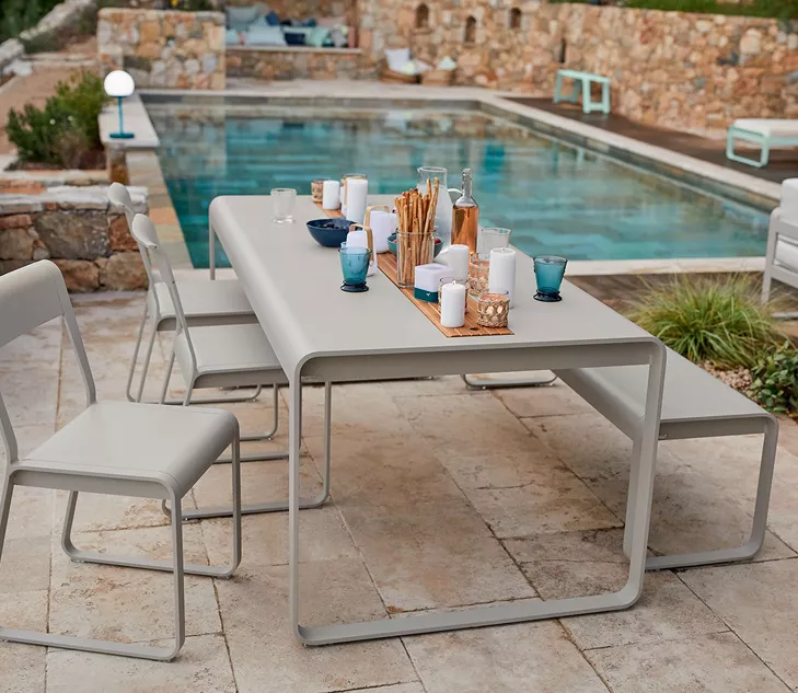 Cette table avec rangement démontre une créativité sans limites. Elle partage toutes les qualités des autres pièces de mobilier de la gamme Bellevie : robustesse grâce à l’aluminium et à la peinture poudre polyester, fabrication française, des courbes élégantes au design très contemporain, et une résistance garantie aux rayons UV et aux intempéries.