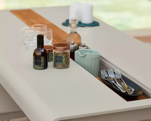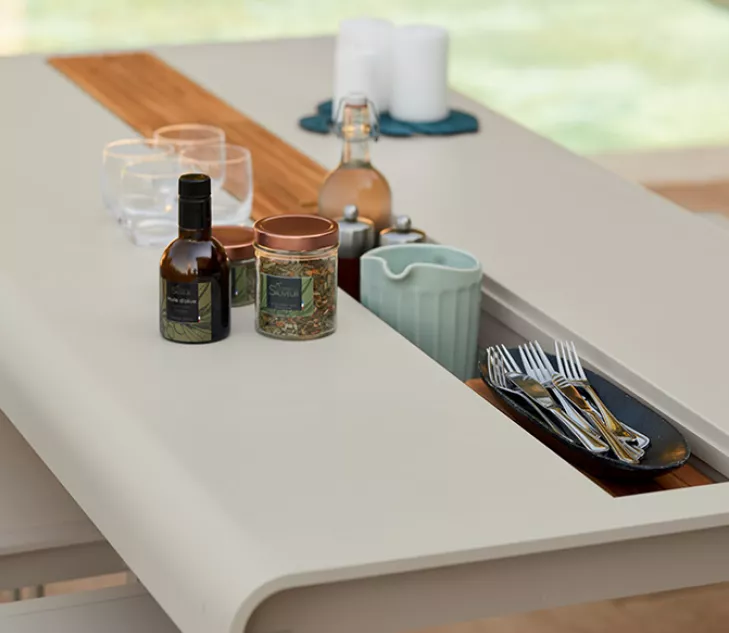 La nouvelle table de la collection Bellevie est dotée d’un casier central – compartiment de rangement intégré – parfait pour les bouteilles, les couverts, les serviettes ou les épices. Les inserts peuvent également être utilisés comme dessous de plat.