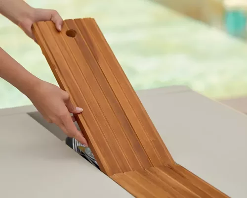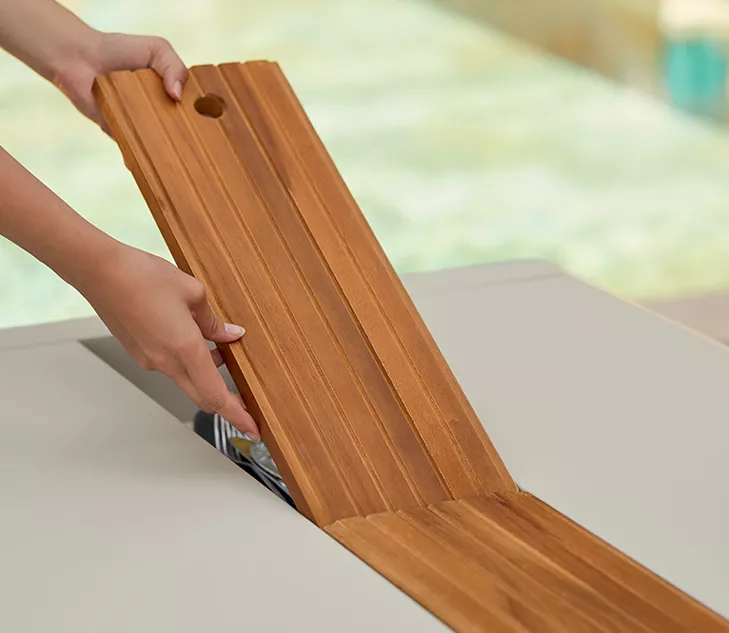 Une fois le repas terminé, replacez les 4 tablettes en teck sur la travée, côté lisse, pour créer un joli chemin de table où vous pourrez disposer des fleurs, des bougies, etc. Pendant les repas, ces tablettes peuvent également être utilisées comme dessous de plat grâce à leur côté rainuré.