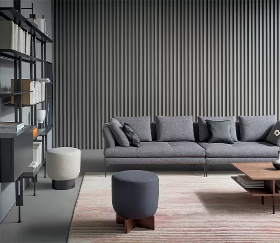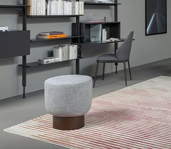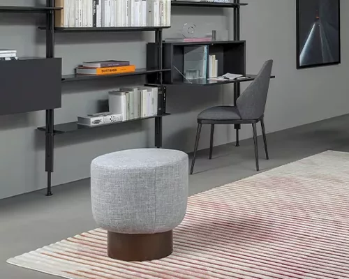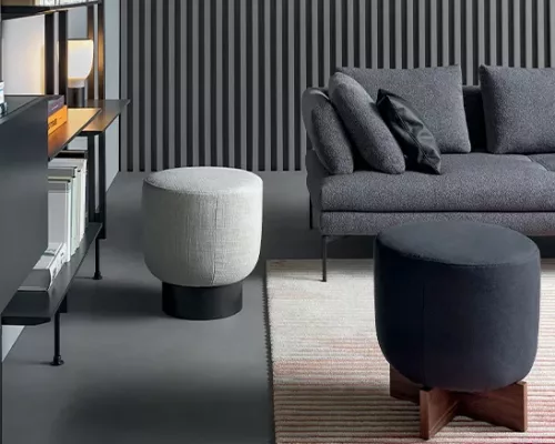 Ils se distinguent par leurs bases, qui donnent chacune de une personnalité distincte : le piètement rond en métal du pouf Belt joue avec le concept de stabilité, tandis que Cross en bois en forme de croix.