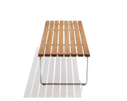 Bien que le banc ne présente pas les tiges de métal, signature de sa collection, il possède une assise en lattes de bois laqué, qui repose sur une structure en métal.