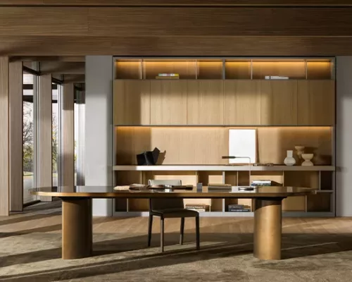 La partie supérieure des supports verticaux est liée au plateau de la table au moyen de deux éléments en bois en forme de chapiteau. L’utilisation de formes courbes répond à la nécessité de souligner la continuité du plateau de table, en évitant les interruptions.