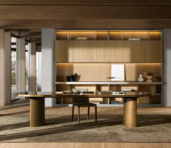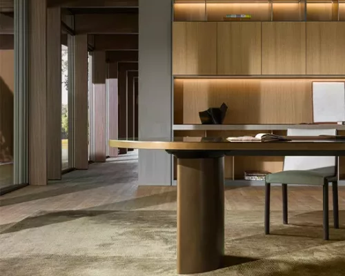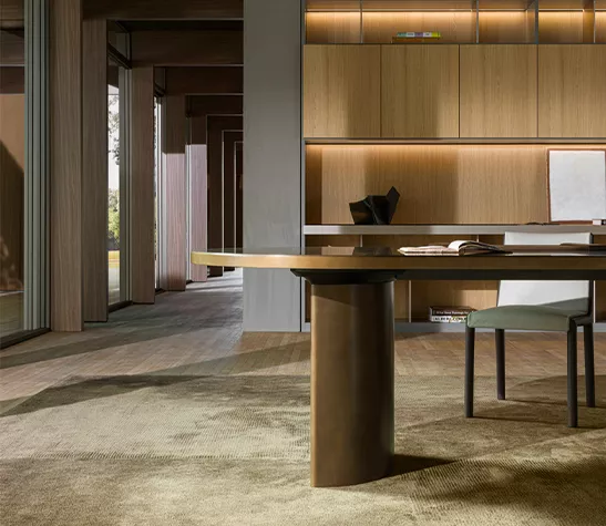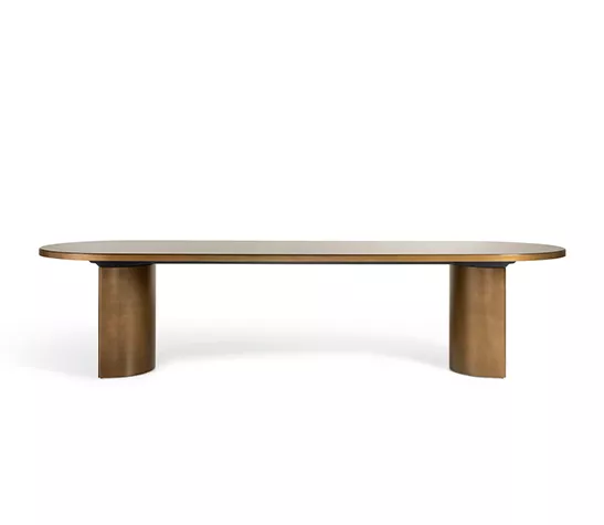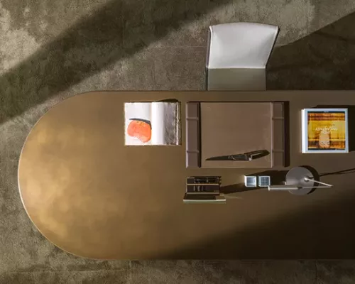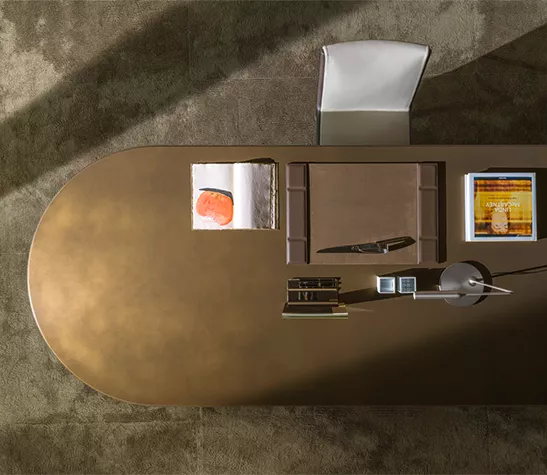La pièce originale est recouverte de cuivre, un matériau difficile à conserver pour les tables à manger contemporaines. Le centre de recherche et de développement de Molteni&C a remplacé la lame de cuivre du plateau en bois par un vernis spécial en poudre métallique qui donne le même effet de solidité et de brillance artisanale, conférant une plus grande résistance.
