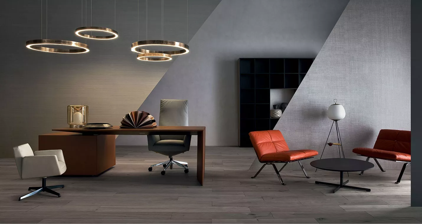 La forme pure, le mélange des matériaux, la solidité d’une structure techniquement avancée, l’âme de Poltrona Frau. Lella et Massimo Vignelli conçoivent des micro-architectures plutôt que de simples meubles pour diviser et peupler habilement les espaces des lieux de travail les plus prestigieux.