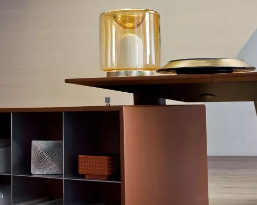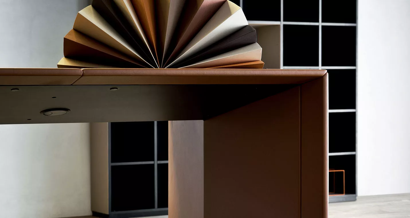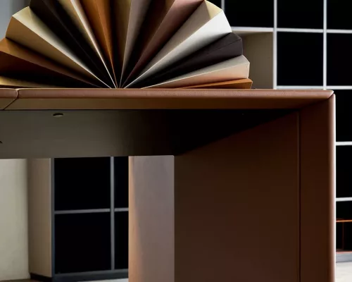La série C.E.O. Cube se compose de tables de réunion, de bureaux de direction et de placards. L'essentialité géométrique s'allie à la valorisation des matières, du cuir noble Pelle Frau® au bois en passant par les alliages d'aluminium.