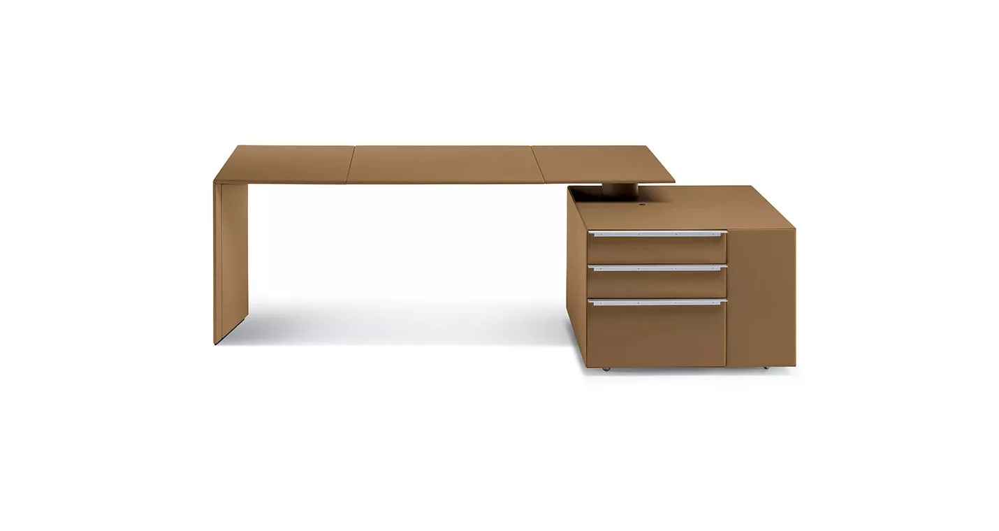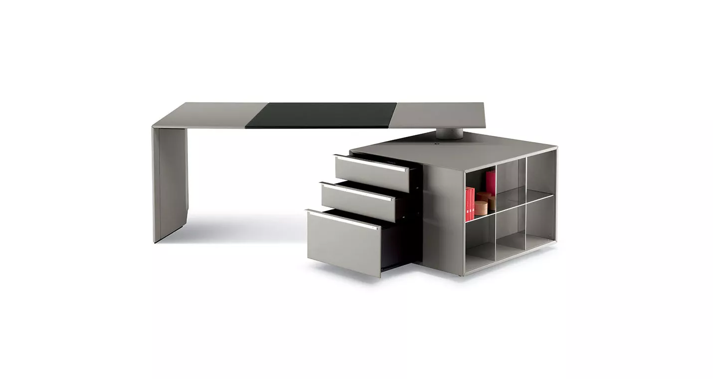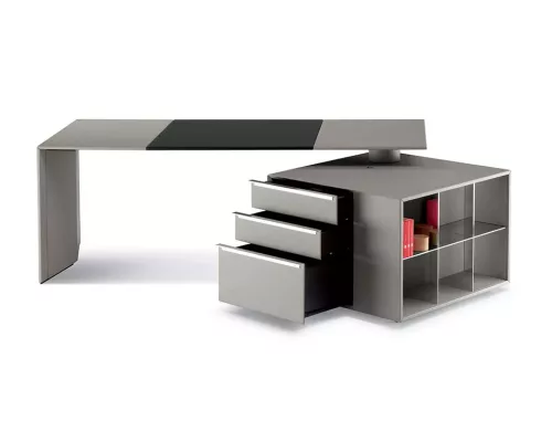 Le modèle Desk présente une confi guration asymétrique : le bureau est soutenu d’un côté par un meuble en cube, de l’autre côté par un pied.