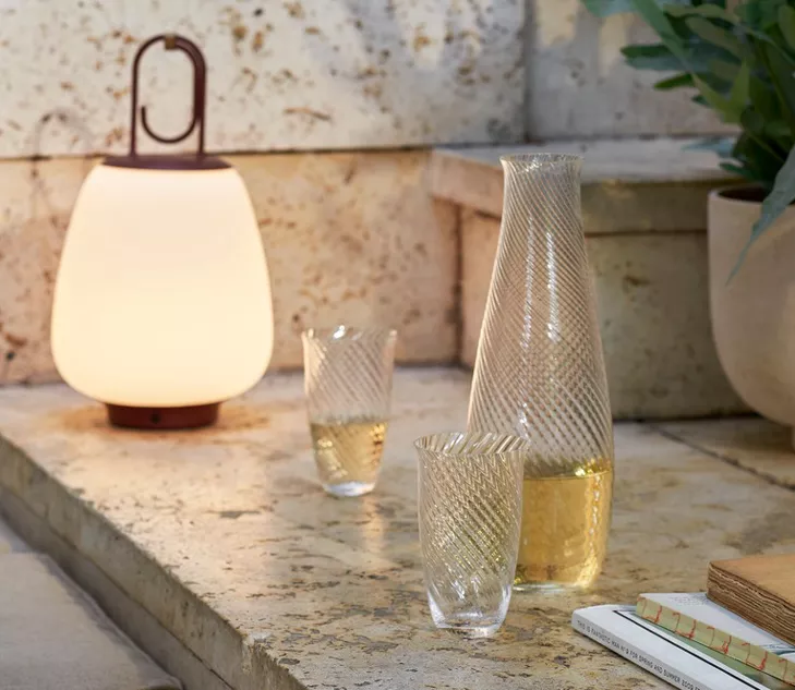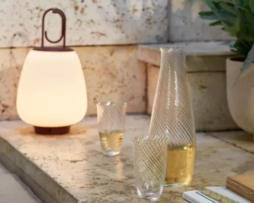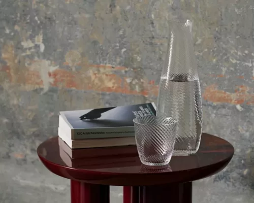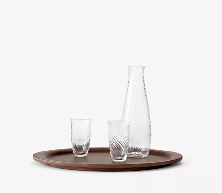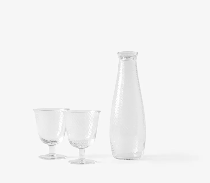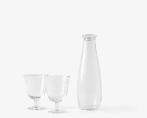 Disponible en deux tailles, la carafe à eau s’inscrit dans la collection Collect, regroupant une série de pièces d’arts de la table conçus par Space Copenhagen pour & Tradition. Des ensembles de verres et verres à pied assortis sont également disponibles.