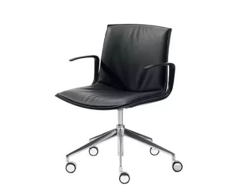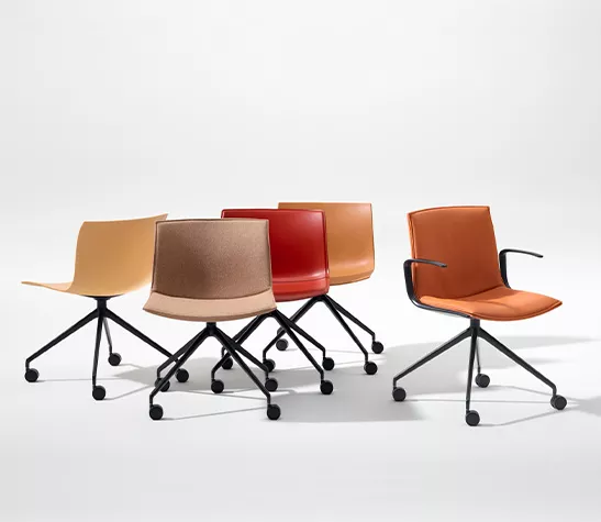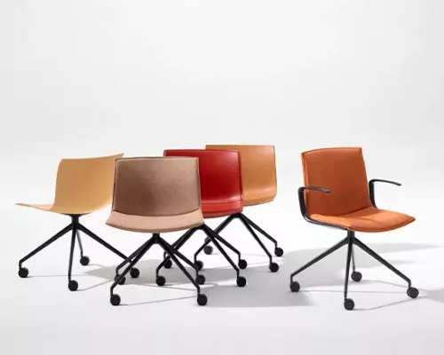 Au profil épuré de la version avec revêtement standard s’ajoute Catifa, une version caractérisée par un rembourrage moelleux assuré par un double coussin qui garantit un niveau supérieur de confort. Les coques se combinent avec tous les piètements de la collection, pour former des configurations pouvant satisfaire tous les besoins: tréteau et cinq branches, tous deux sur pieds ou roulettes. Pour compléter l’élégant profil de ce siège, des accoudoirs optionnels en aluminium, nouvellement conçus.