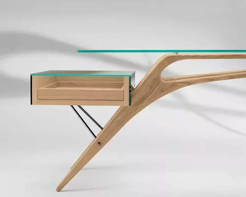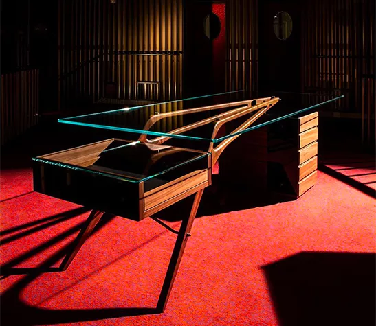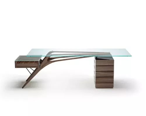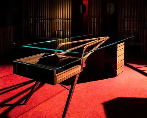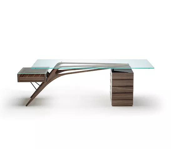 Cavour est un bureau à domicile , résultat d’un exercice sur la recherche de la forme structurelle parfaite, que Carlo Mollino a étudié dans ses projets pour la station de ski. La dialectique des contraires trouve son expression dans le contraste équilibré entre les lignes organiques et dynamiques de la structure et la géométrie des volumes nets et statiques du compartiment de rangement et de la commode.