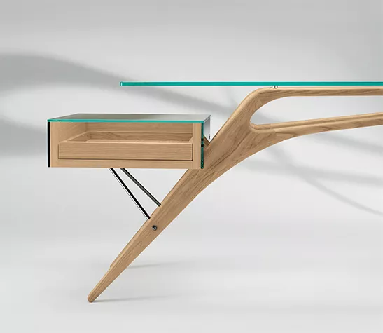 Pieds en chêne massif verni naturel ou noir, ou en noyer Canaletto massif; vernis finition cire. Plateau ouvert extractible et élément de tiroir en placage de chêne naturel ou verni noir, ou en noyer Canaletto, vernis ciré, tous deux recouverts de plaque de verre extra-clair trempé, rétro-peint en noir. Plateau en verre transparent ou extra clair ou plateau en verre gris fumé, assorti au cadre en chêne noir.