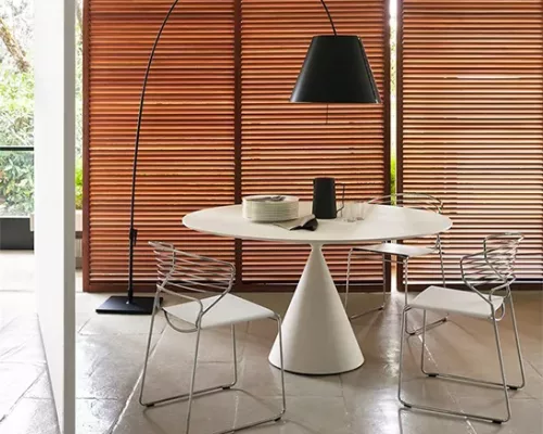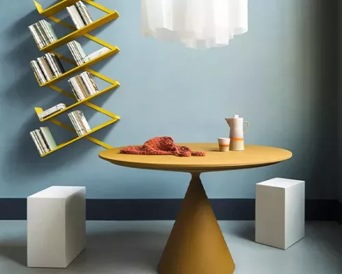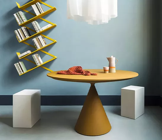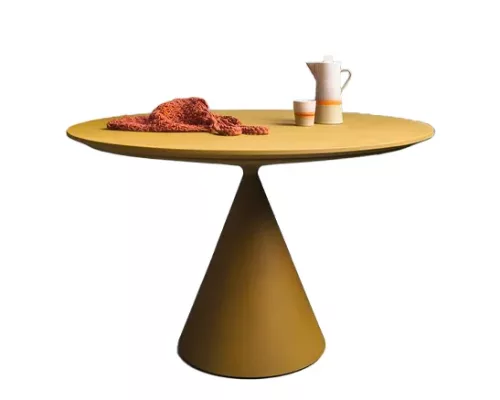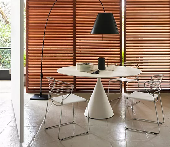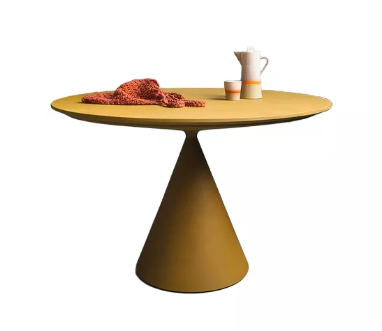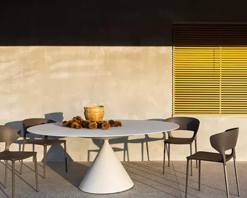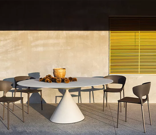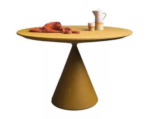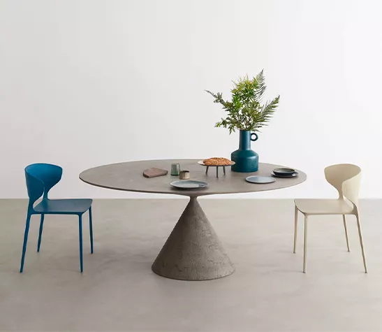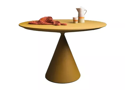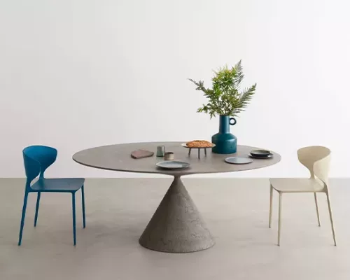 Clay est une table-sculpture née de la rencontre de deux volumes : le plateau et la base, en équilibre l’un sur l’autre, expérimentent le support audacieux d’une section réduite au minimum. Deux cônes de formes différentes se rencontrent à leurs sommets opposés : défiant la gravité dans un équilibre apparemment instable, mais donnant forme à la plus classique des tables rondes. L’argile est l’exception qui devient une règle, comme le design.