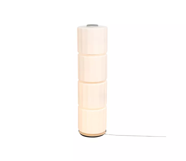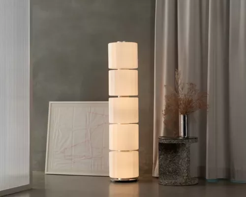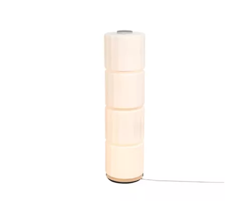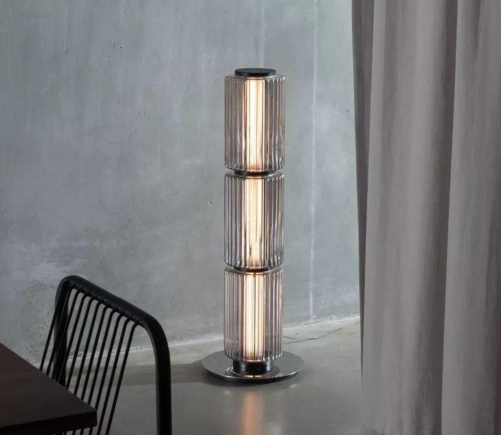 Avec trois à cinq segments verticaux de cylindres de verre soufflé à la machine, le lampadaire Column, conçu par le design Lukas Peet s’élève à partir d’une base ronde en acier inoxydable poli.