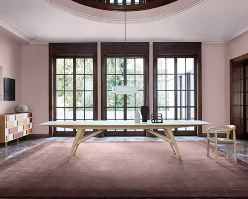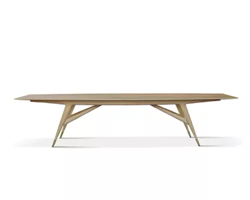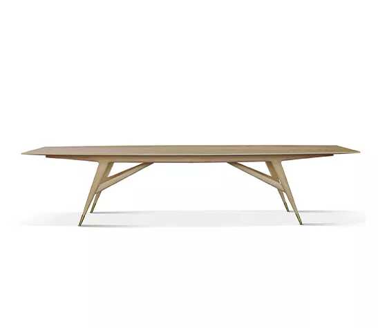 La table D.859.1, utilisée principalement comme grande table de conférence, jusqu’à dix places, se distingue non seulement pour ses dimensions imposantes, plus de 3,60 mètres de longueur, mais surtout pour le design raffiné et essentiel