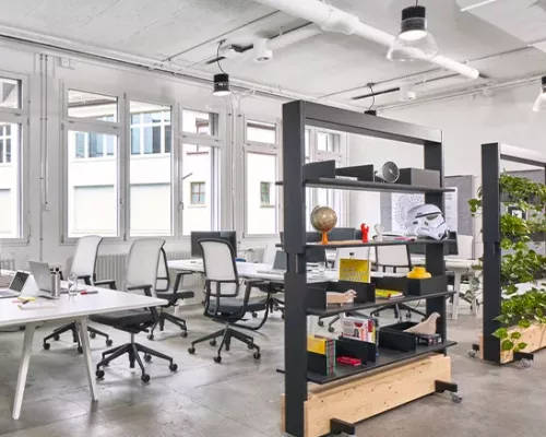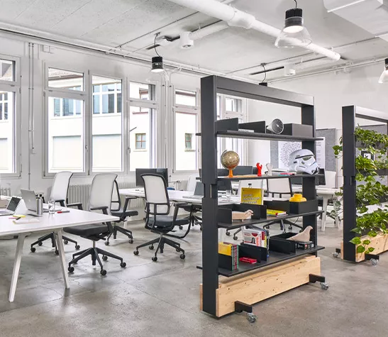 La combinaison de différents Dancing Walls permet de créer d'innombrables agencements de bureaux et scénarios de travail, pouvant être adaptés à des changements en termes de taille d'équipe ou de fonction de la pièce – sans transformations et sans monteur.