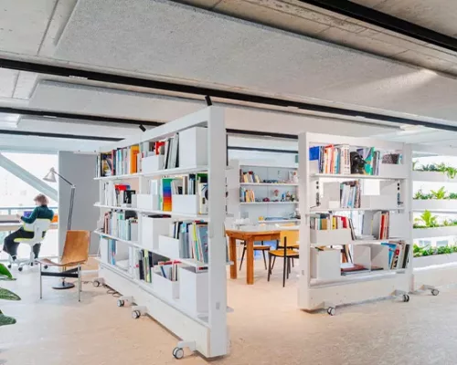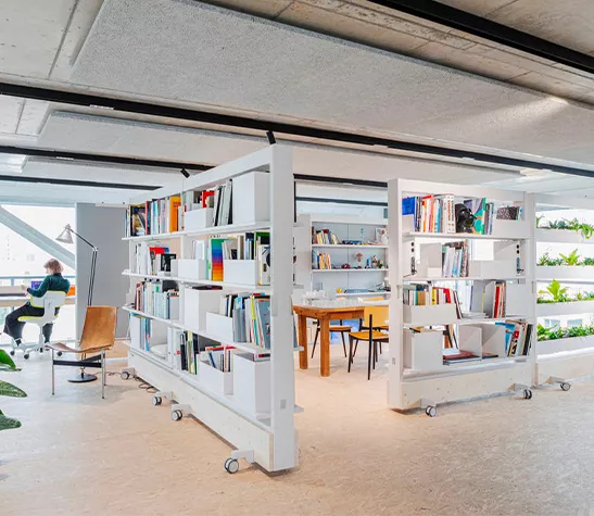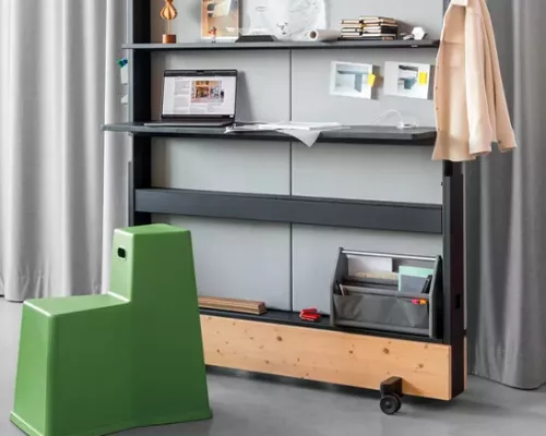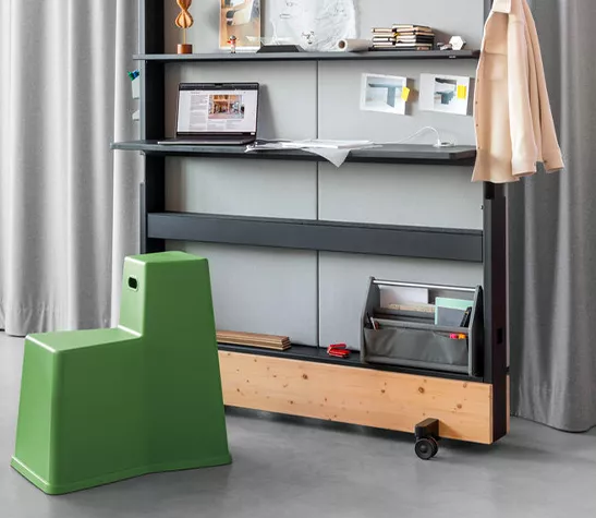 Dancing Wall est une cloison mobile qui permet de diviser les espaces en zones de manière flexible, tout en offrant des surfaces de travail verticales.