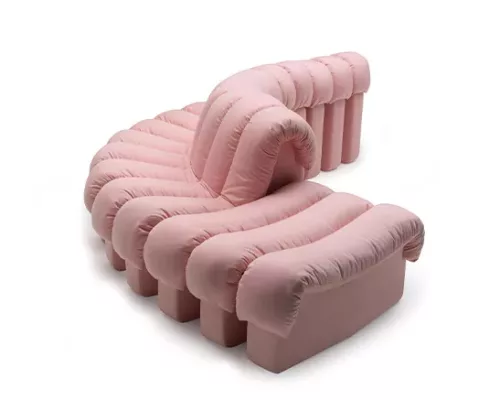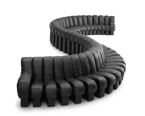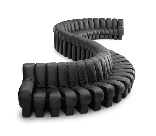 Souvent appelé canapé « Non-stop » ou canapé « serpent », la forme modulaire est créée en attachant des segments qui pivotent vers l’intérieur ou l’extérieur, la longueur est déterminée par le nombre de segments utilisés.