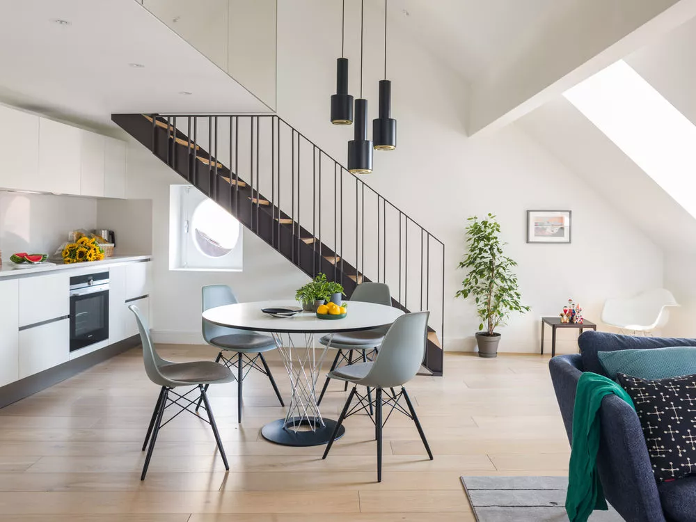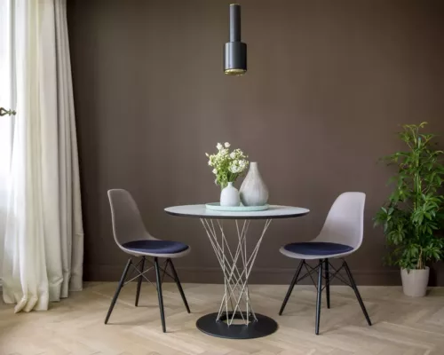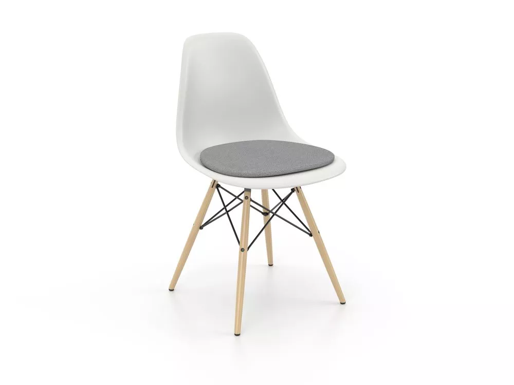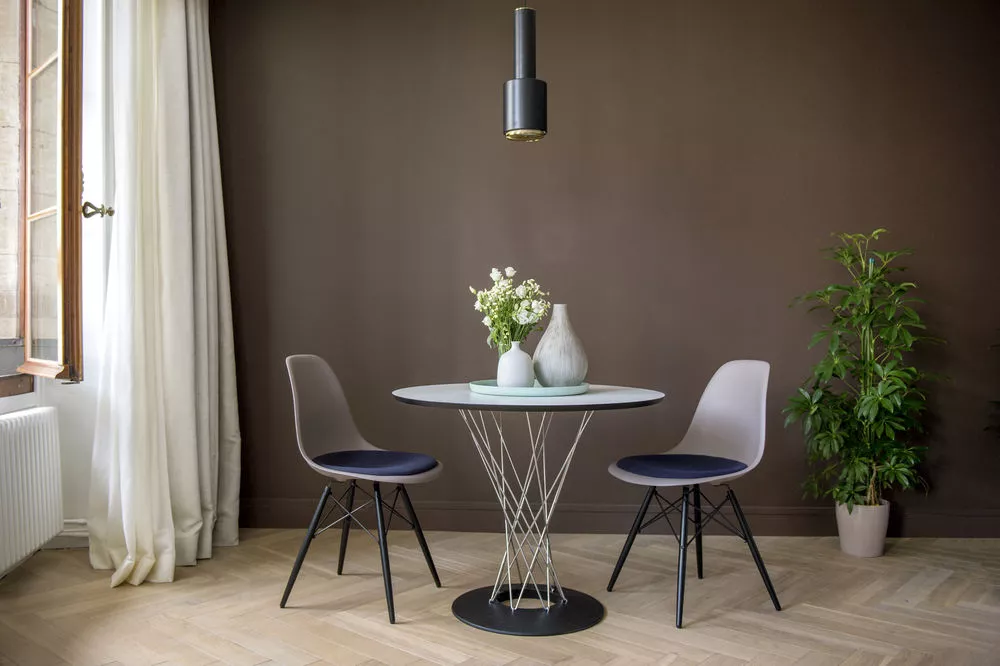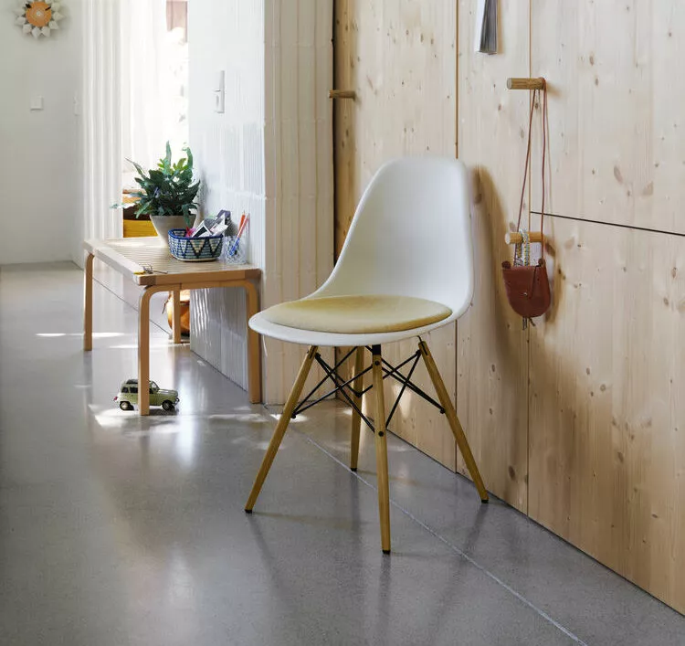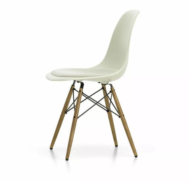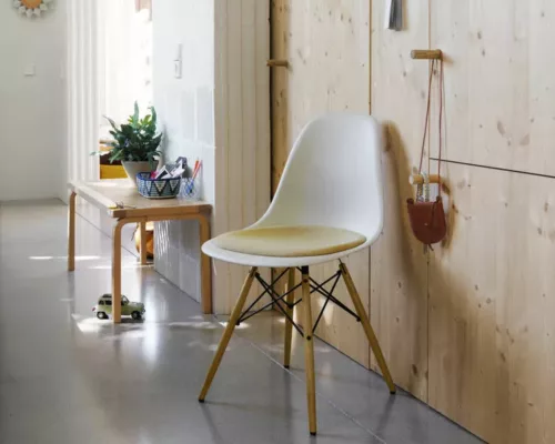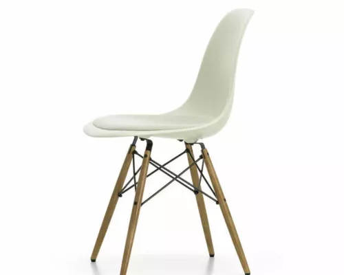 Pour le Dining Height Side Chair Wood Base (DSW), Charles et Ray Eames ont combiné la coque d'assise aux formes organiques à un piètement à quatre pieds en bois.