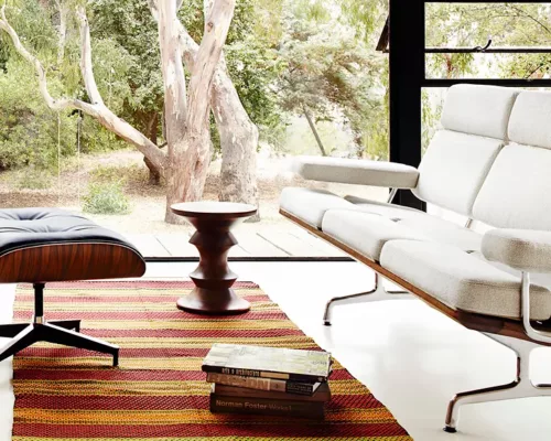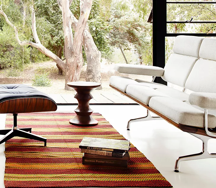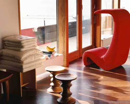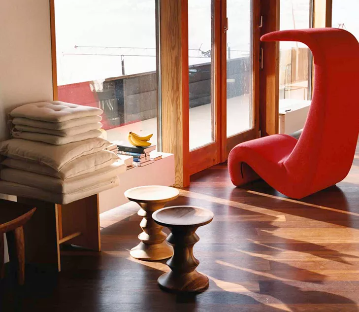 En 1960, la société Time Inc. a confié à l’Eames Office de Charles et Ray Eames la mission de concevoir les aménagements de trois halls d’entrée du Rockefeller Center à New York. Outre la transformation complète de l’intérieur, ce projet a donné naissance aux confortables Lobby Chairs ainsi qu’à une série de tabourets en noyer massif : les Eames Stool.