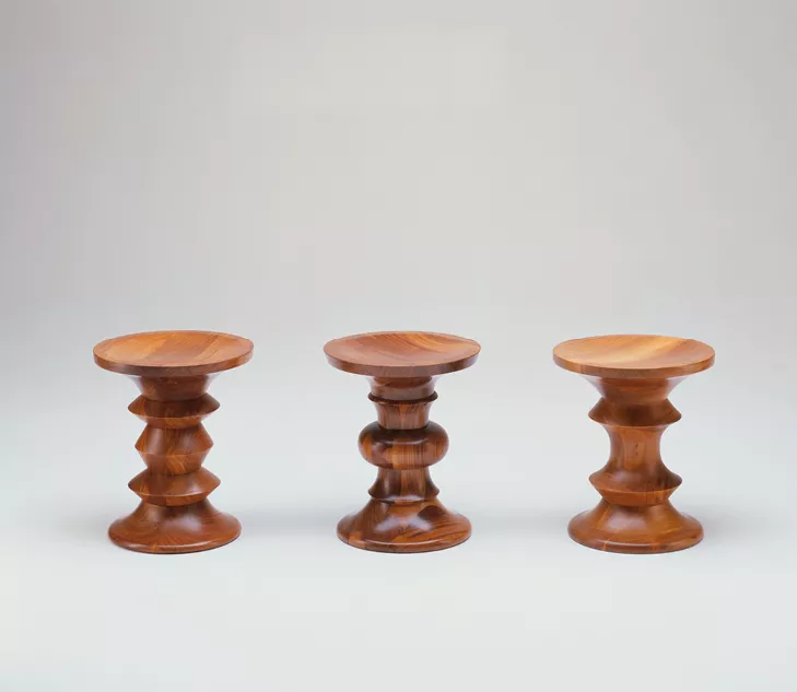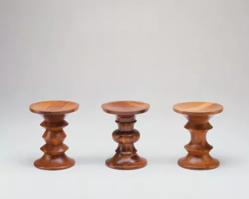 Édités par Vitra, ces tabourets, fabriqués au tour, peuvent également être utilisés comme petites tables d’appoint, répondant ainsi au souhait de Ray Eames. Ils se distinguent par les profils variés de leur partie centrale.