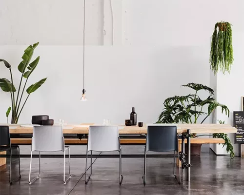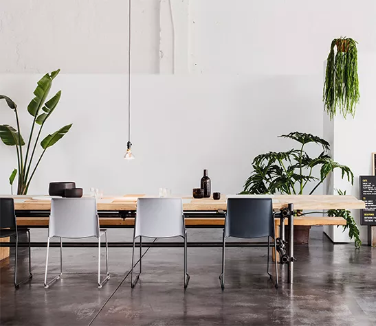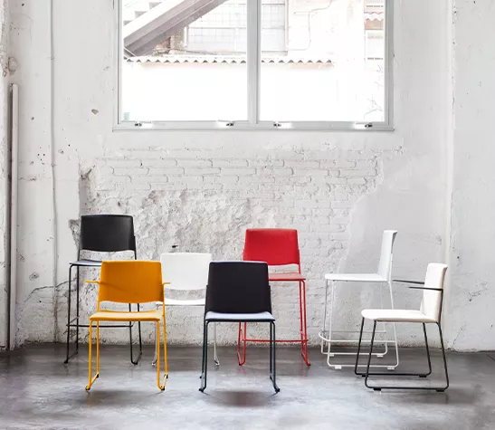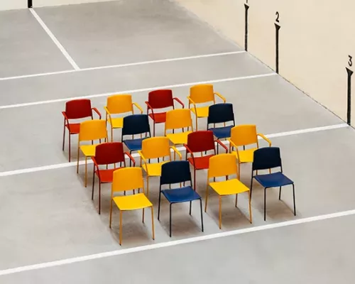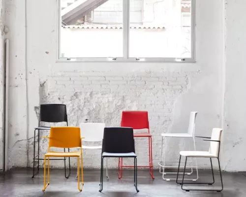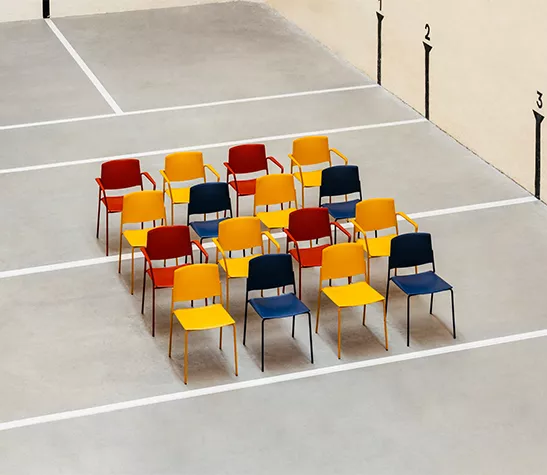 Les chaises de la gamme EMA sont reconnues pour leur capacité d’empilage, pouvant aller jusqu’à 45 chaises. Légère et fonctionnelle, plusieurs finitions et piètements sont disponibles. La structure est disponible en version laquée ou chromée, avec des accoudoirs en aluminium poli. L’assise peut être en polypropylène ou recouverte de tapisserie, tout comme le dossier.