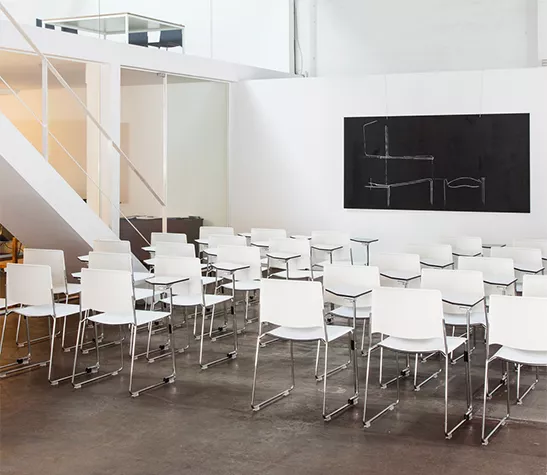 Elle incorpore un pad d’assise tapissé, très pratique dans les espaces polyvalents ou recevant du public grâce à une plus grande facilité d’empilement avec moins de friction que la version à tapisserie complète.