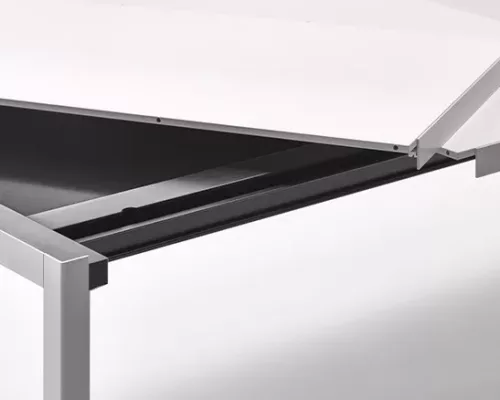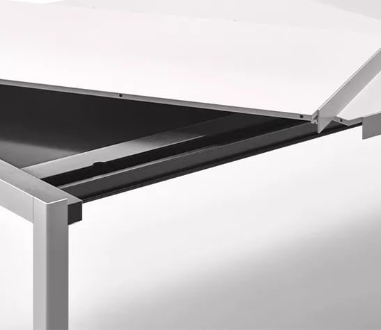 La flexibilité du système est soulignée par la présence d’un ou deux plateaux d’extension mesurant 50 cm chacun et reposant sur les glissières du châssis. Selon les besoins du client, la longueur nominale de la table peut être augmentée de 50 cm (1 rallonge) à 100 cm (2 rallonges), pour accueillir des invités inattendus ou pour s’adapter au mieux à l’environnement.