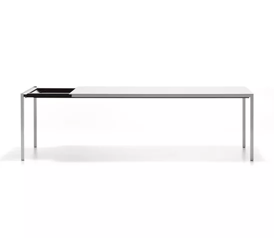 Les plateaux des rallonges coulissent dans un plateau peint en poudre époxy mate, équipé d’un revêtement anti-rayures.