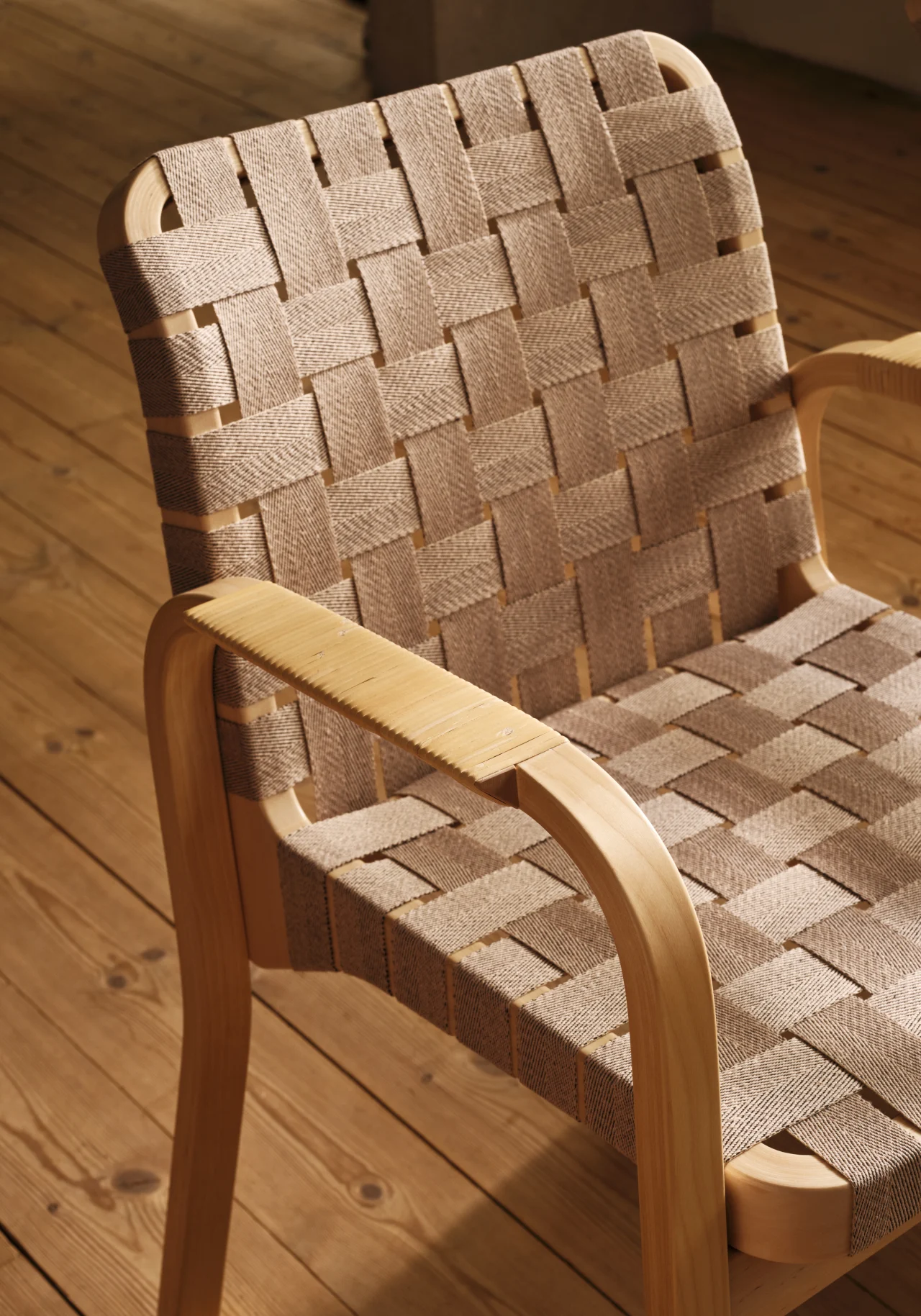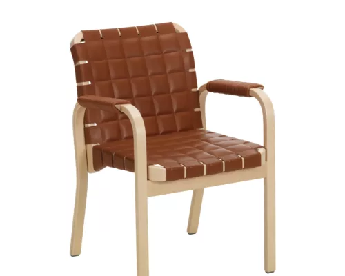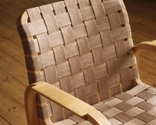 La chaise trouve sa place aussi bien autour de la table à manger, derrière un bureau ou comme déclaration d’intention au cœur de l’espace de vie. Son potentiel d’utilisation commerciale, dans les salles à manger, les salles de réunion ou les espaces de travail, est mis en évidence par la manière dont son créateur l’a utilisée ; de nombreuses photographies d’archives montrent Alvar Aalto assis dans une version recouverte de cuir dans son studio de Tiilimäki.
