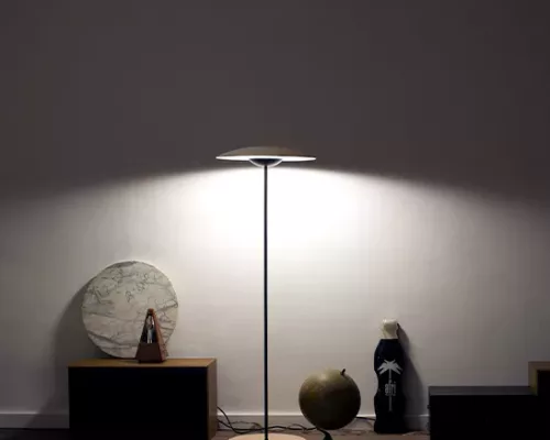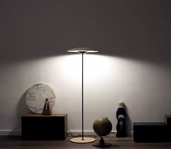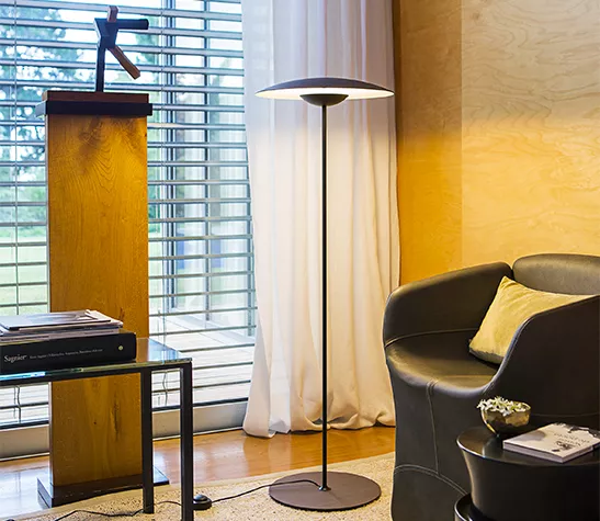 La base du lampadaire est également réalisée en contreplaqué de chêne. Les sources LED situées dans le dissipateur (coupelle située sous l’abat-jour) fournissent un éclairage agréable et non éblouissant, dirigé vers le bas. L’intérieur de l’abat-jour est blanc.