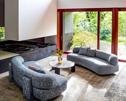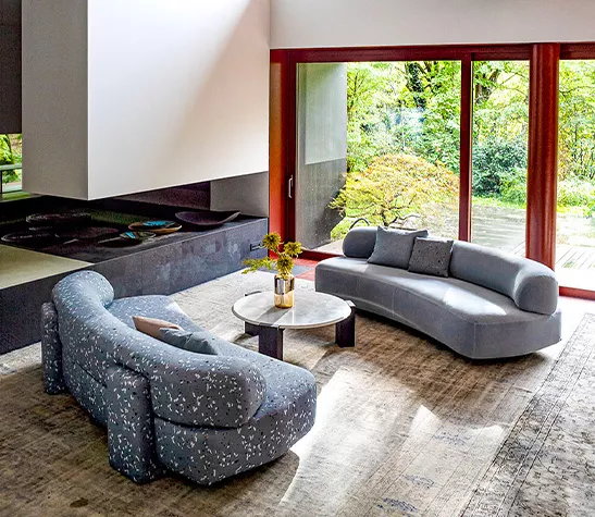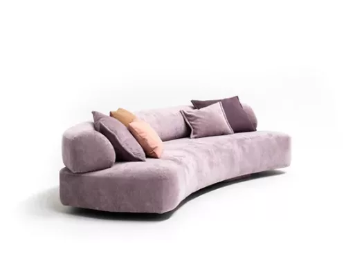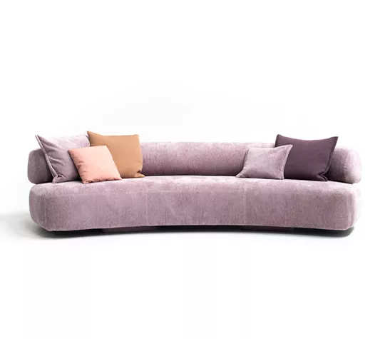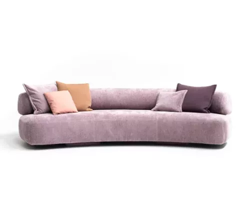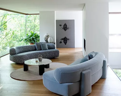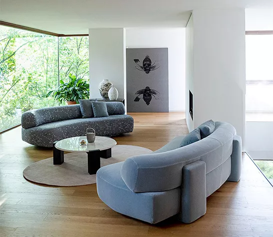 Dessiné par Patricia Urquiola, les formes du canapé évoquent en effet les douces pierres sculptées par le vent et par l’eau, à la fois massives et douces, sur lesquelles se reposer. Comme dans les sculptures de pierres, où les galets sont en équilibre en vertu des encastrements et de la position, l’équilibre entre les éléments du canapé et du fauteuil Gogan est dû à la forme, légèrement irrégulière: grâce à un délicat exercice entre la gravité et l’équilibre, des formes qui devraient être lourdes deviennent légères.