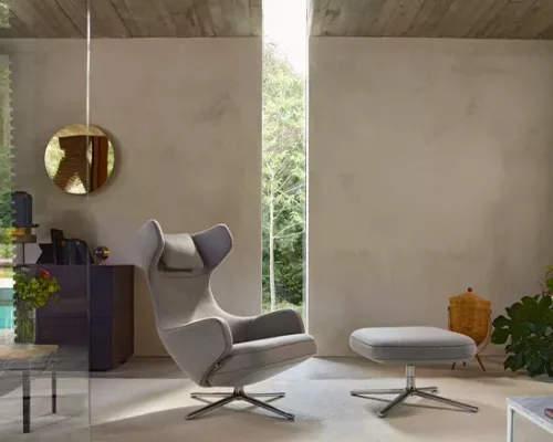 Un mécanisme synchrone est dissimulé sous le rembourrage du large fauteuil Grand Repos et peut être bloqué dans toute position, assurant un soutien optimal du dos et un confort maximal. L’appuie-tête caractéristique crée un sentiment de repli et de sécurité.
