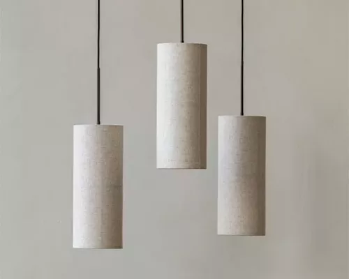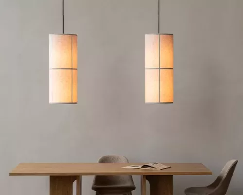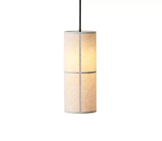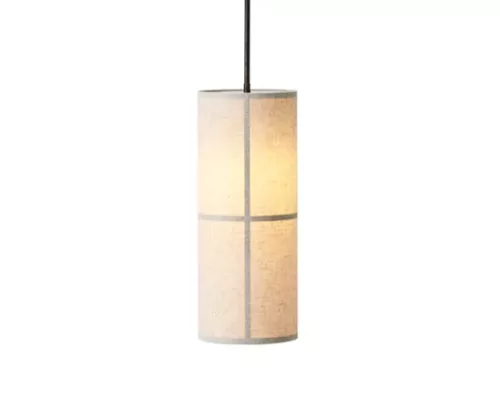 La suspension Hashira se compose d’un abat-jour cylindrique en lin monté sur une structure en acier.