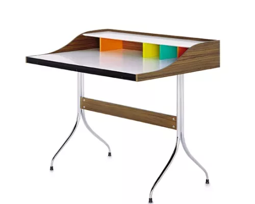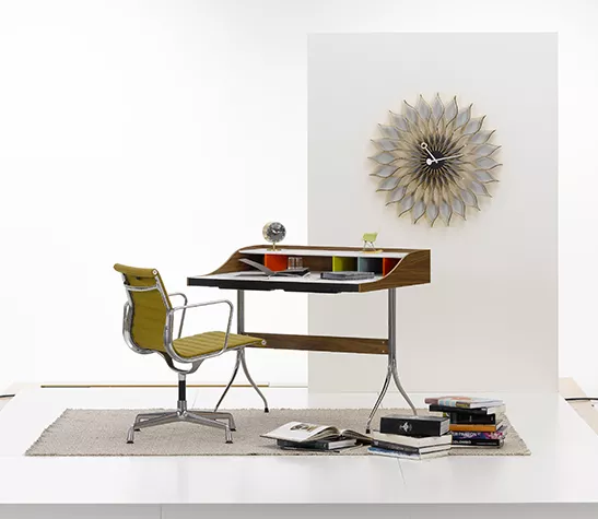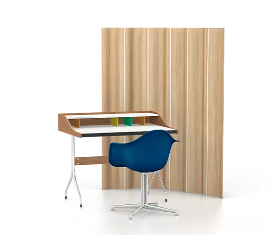En collaboration avec l’Eames Office et la créatrice néerlandaise Hella Jongerius, un nouvel assortiment de couleurs a été soigneusement défini pour apporter une note de fraîcheur et de modernité au EDU, tout en conservant son esprit des années 1940 et 1950. Les panneaux servent également de cache et de protection partielle des deux compartiments de rangement. La structure en métal est réglable en hauteur pour s’adapter aux sols irréguliers.