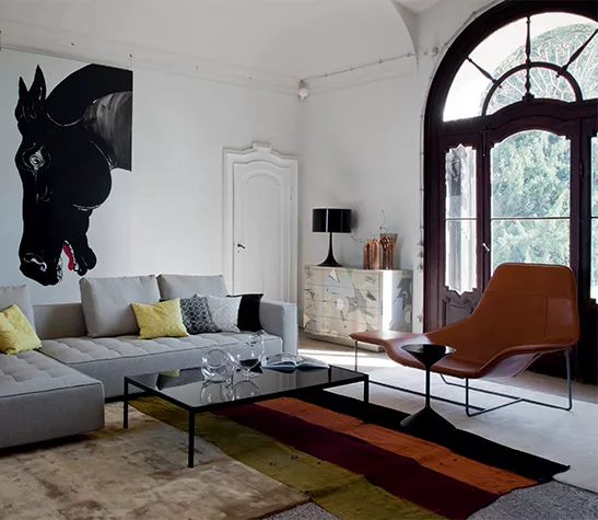 Rembourrage en mousse de polyuréthane autoextinguible avec suspensions sur sangles élastiques. Revêtement déhoussable en tissu ou cuir, ou pas déhoussable en cuir sellier.