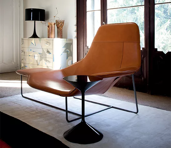 Le fauteuil possède un rembourrage en mousse polyuréthane avec suspensions sur sangles élastiques. Le revêtement en cuir sellier marron est déhoussable. Lama est la représentation parfaite de l’adéquation entre qualité du savoir faire et fabrication artisanale avec le design. Un fauteuil emblématique depuis 2006, confortable et élégant, qui amène une touche graphique à votre salon.