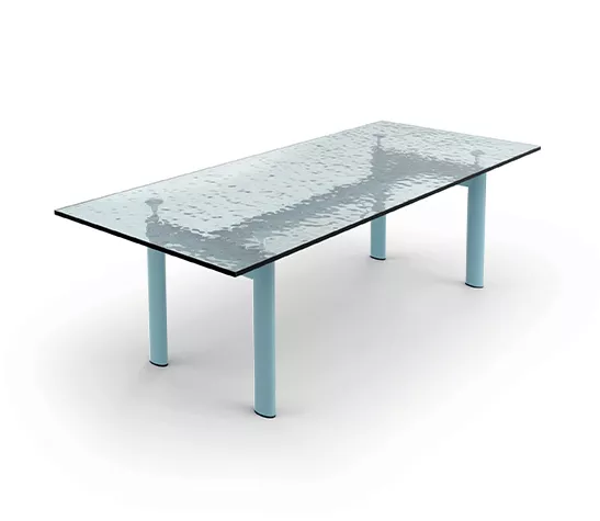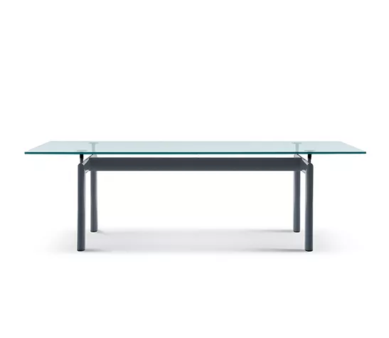 La version actuelle de la table rectangulaire iconique arbore un piètement en acier peint dans les couleurs de la palette de Le Corbusier, tandis que le plateau est disponible en cristal, en verre trempé, en bois ou dans les précieuses finitions en marbre blanc de Carrare ou noir Marquina. Elle présente une longueur de 225 cm, une largeur de 85 cm et une hauteur allant de 69 cm à 74 cm.