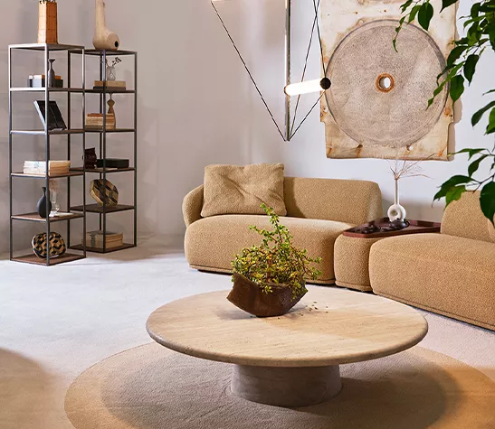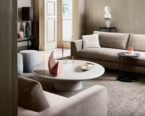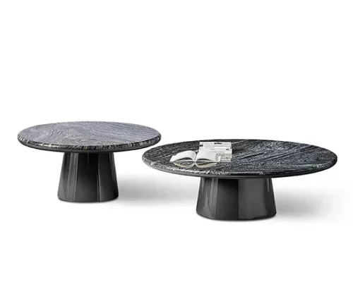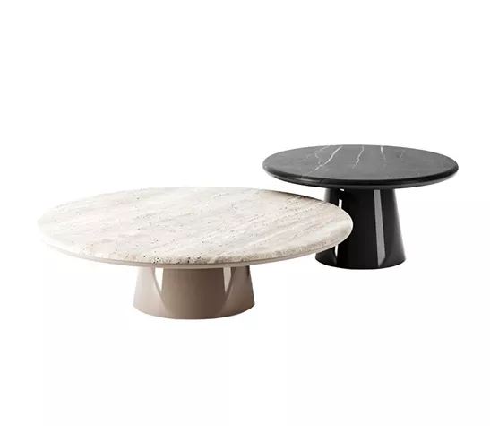 Dans la version marbrée, la finition apportée à la coupe circulaire, séparant le dessus du dessous, devient un élément décoratif, pour créer une pièce unique en son genre. La version 2022 se présente complètement en marbre pour plateau et base, pour un effet encore plus sculptural.