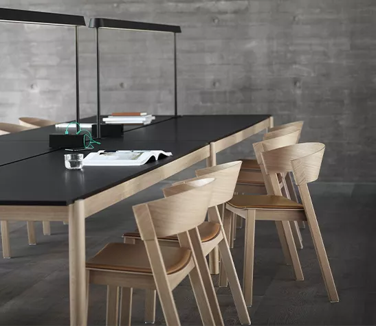 Les plateaux de table en placage de chêne de la série Linear System sont fabriqués à l’aide d’un placage mélangé de haute qualité afin d’éviter les différences d’aspect visuel d’un plateau à l’autre.