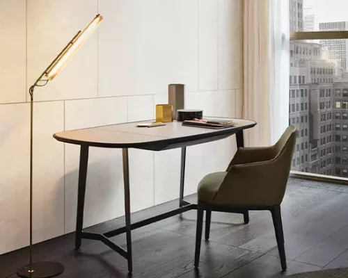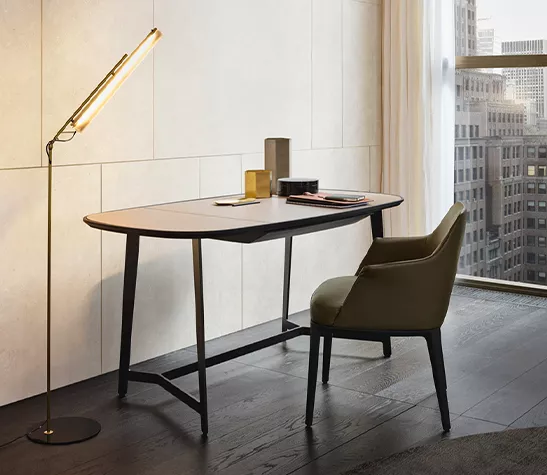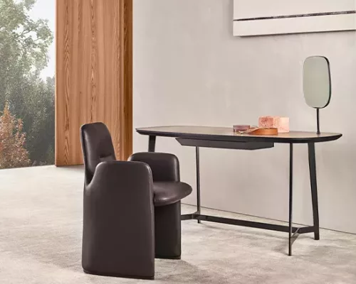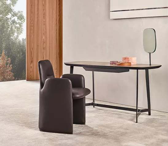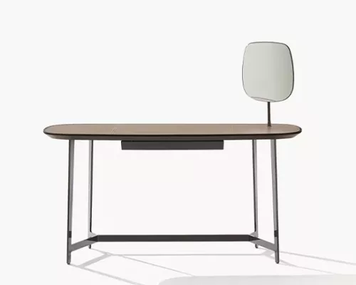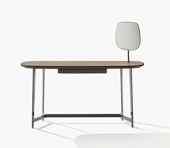 Le plateau, avec une structure en bois et un insert en cuir, trace des courbes subtiles qui adoucissent les lignes fortes de la structure en métal peint. Les accessoires optionnels – le petit tiroir sous le plateau et le miroir – sont élégants et discrets, ce qui en fait un complément parfait pour les espaces chambre.