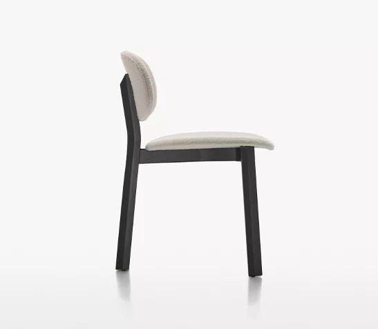 La chaise Med de Lodovico Acerbis et Giotto Stoppino, avec ses courbes et sa linéarité contrastée, prend de nouvelles dimensions légères, avec des proportions plus aériennes pour ses pieds et ses montants en noyer ou en frêne noir.