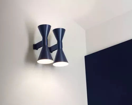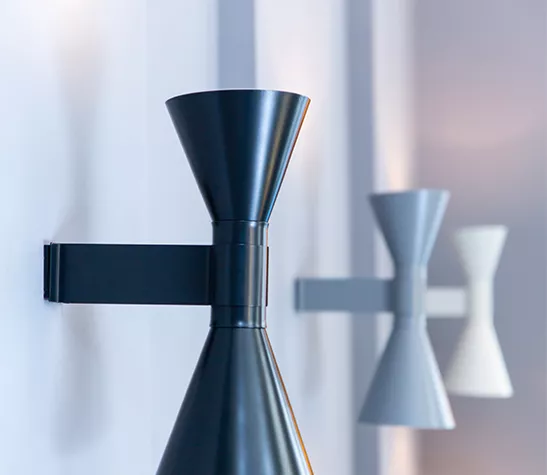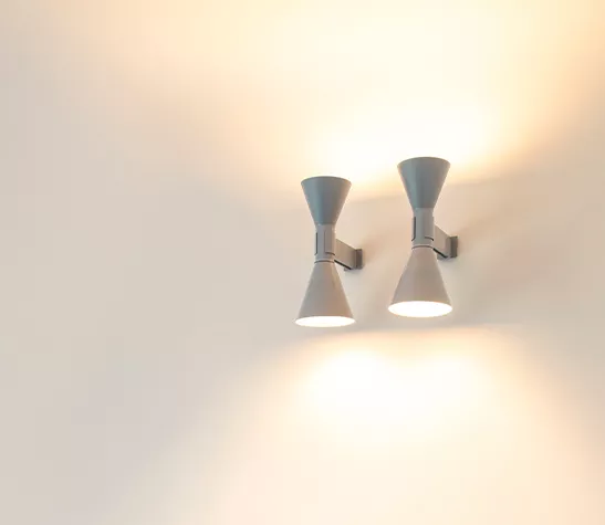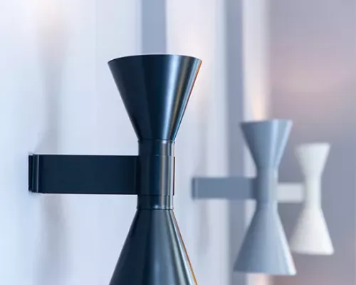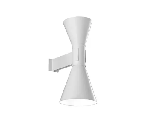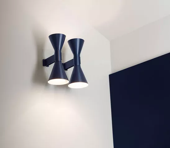 Dessinée par Le Corbusier pour son appartement parisien de rue Nungesser et Coli : une applique à éclairage direct et diffus. Deux diffuseurs en forme de cône dirigent la lumière vers le haut et vers le bas, créant des faisceaux lumineux homogènes et nets.