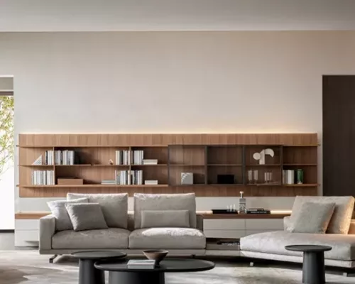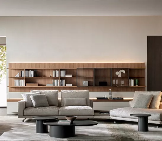 Un projet aux lignes géométriques essentielles, basé sur des éléments juxtaposables qui permettent de créer des compositions linéaires et en angle ou par l’insertion d’éléments suspendus trapézoïdaux ou rectangulaires, des configurations absolument séduisantes et inédites.