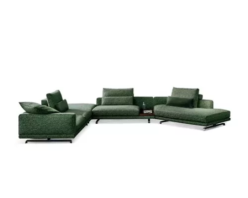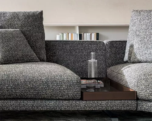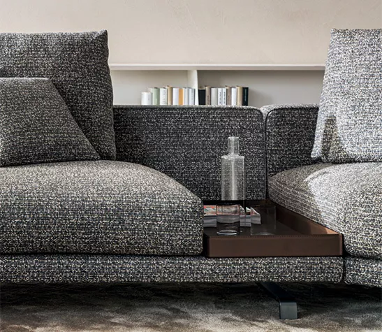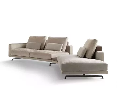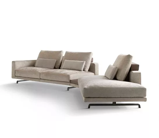 Des pieds en forme de lame, en acier moulé sous pression soutiennent la base garnie de dossiers bas rembourrés, rectangulaires, en tissu ou en cuir, de même épaisseur que les confortables coussins d’assise.