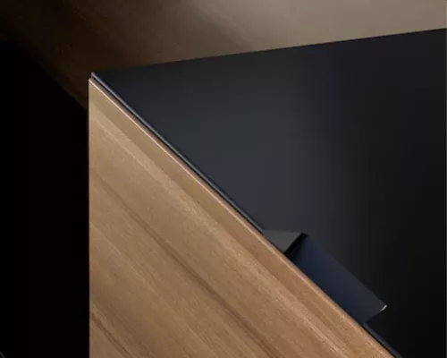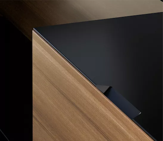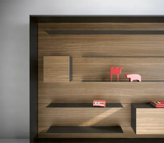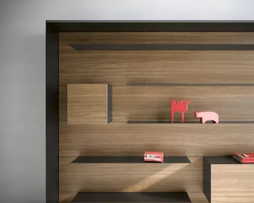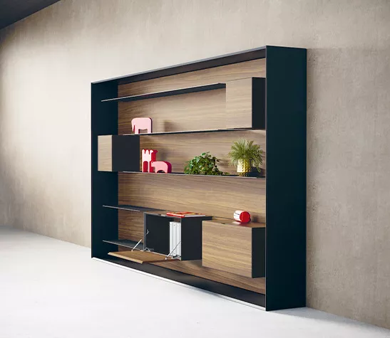Le cadre mince dessine un espace géométrique, animé par des lignes obliques et des étagères en acier et des armoires murales en bois. Disponible sous forme de bibliothèques murales, d’armoires murales et de buffets, ce système répond aux exigences esthétiques et fonctionnelles du bureau de direction contemporain.