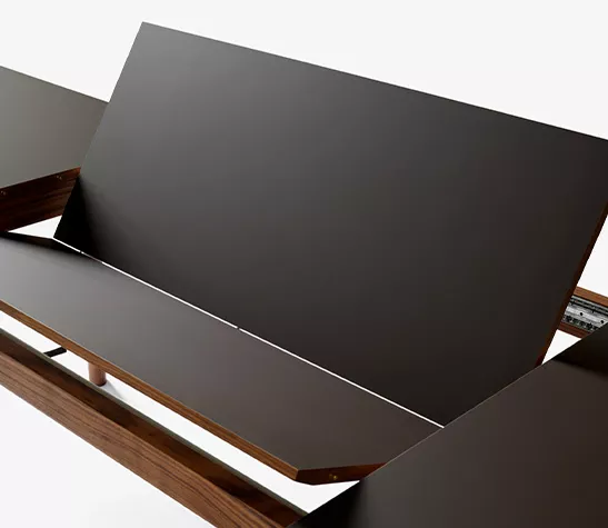 Cette table à manger extensible de Hee Welling utilise la technique de l'extension papillon pour offrir des places assises à un plus grand nombre de personnes.